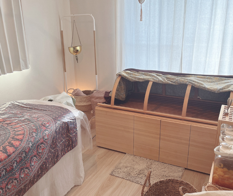 全国でも珍しい「寝たままよもぎ蒸し発汗ベッド」。